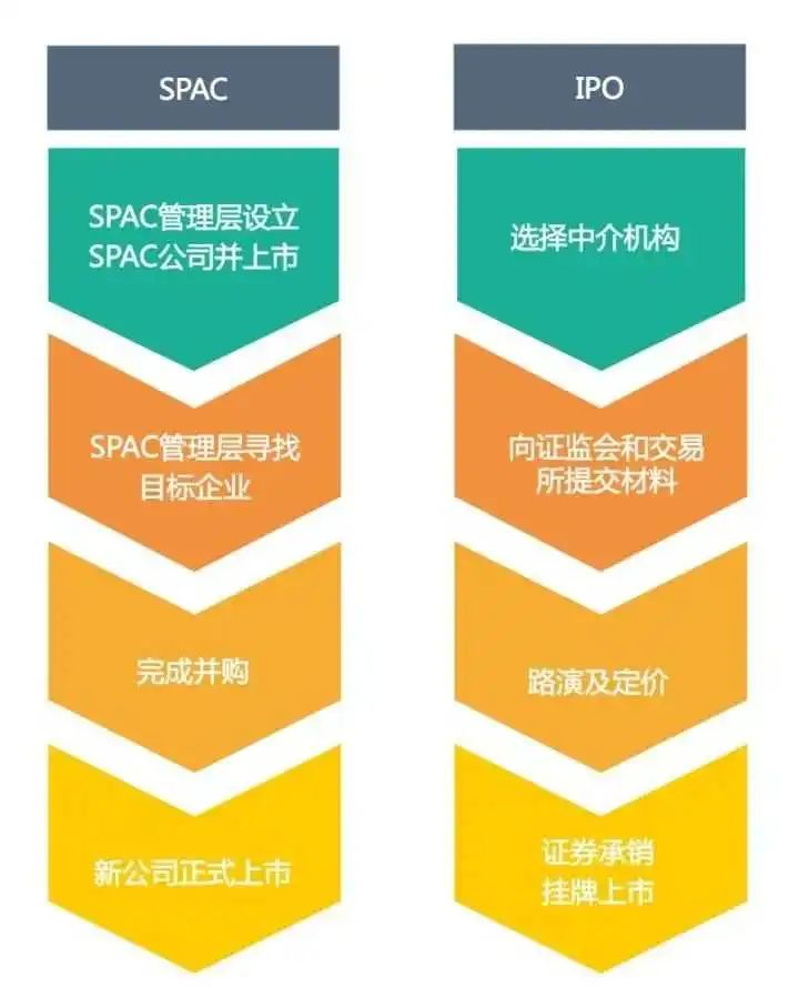 通过传统IPO方式上市,需要完成选择中介机构、向证监会和交易所提交资料,路演定价等流程。然而,通过SPAC的方式上市,目标企业只需要与已上市主体合并,即可完成上市。